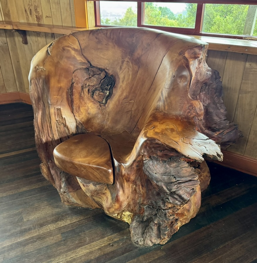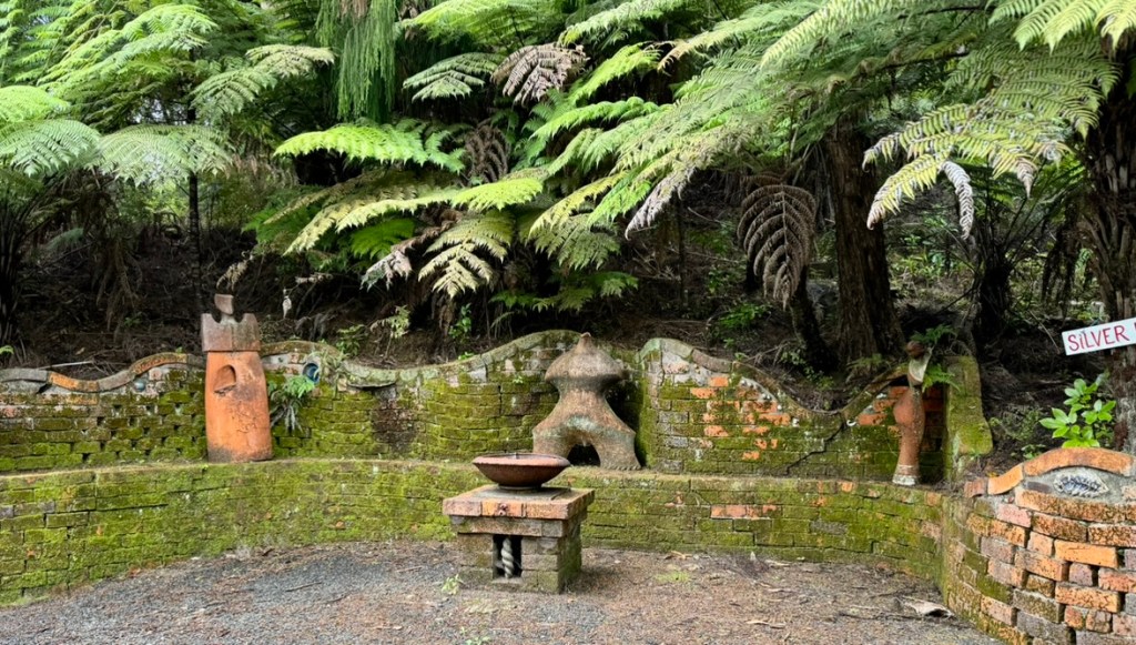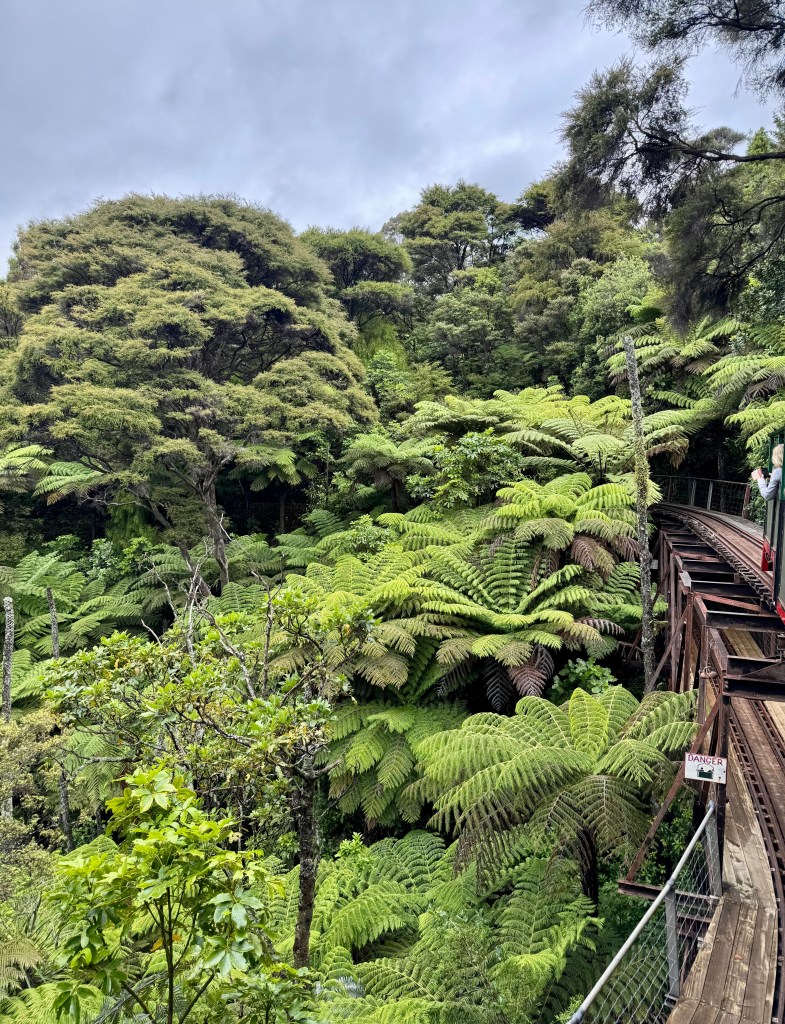 Before we left the Coromandel Peninsula we stopped in the town of Coromandel for lunch and to ride the Driving Creek Railway train. I heard about the train from a fellow traveler that we met on the R. Tucker Thompson tall ship tour. During out tour and from reading their handout, we learned Barry Brickell started this inspiring project in 1973, eventually building 3 kilometers of torturous narrow gauge railway track over a 54-acre area of hilly scrub covered land. Building the Railway from scratch required the daunting task of surveying a route through very rough country. Trial surveys were made with a hand slasher and home-made surveying instruments. This process having to be repeated until a suitably graded route could be found. Much of the track work we see today was done by hand and local contractors were called into help with major earthworks. Bridges/viaducts, three short tunnels, two spirals and five reversing points are required to gain elevation to the EyeFull Tower. The Driving Creek Railway opened to the public in 1990.