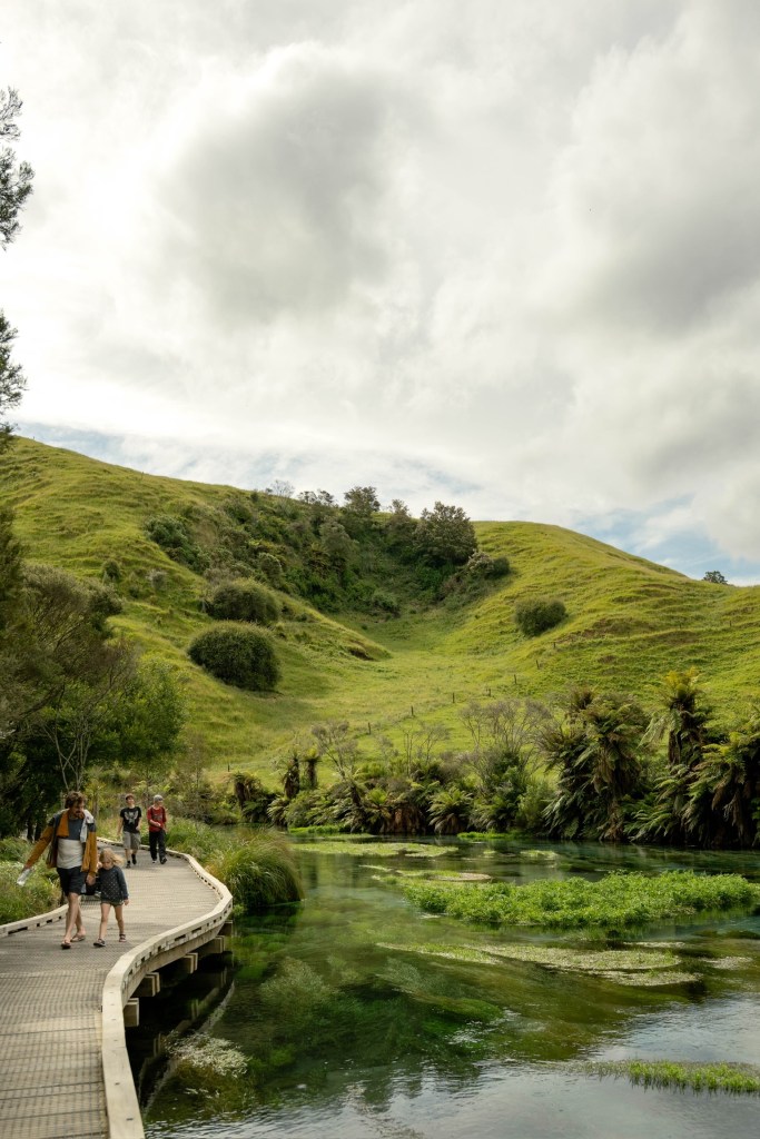 The track travels alongside the Waihou River, winding through wetlands, across rolling pastures with grazing cows and past small waterfalls to the turquoise water of the spring.