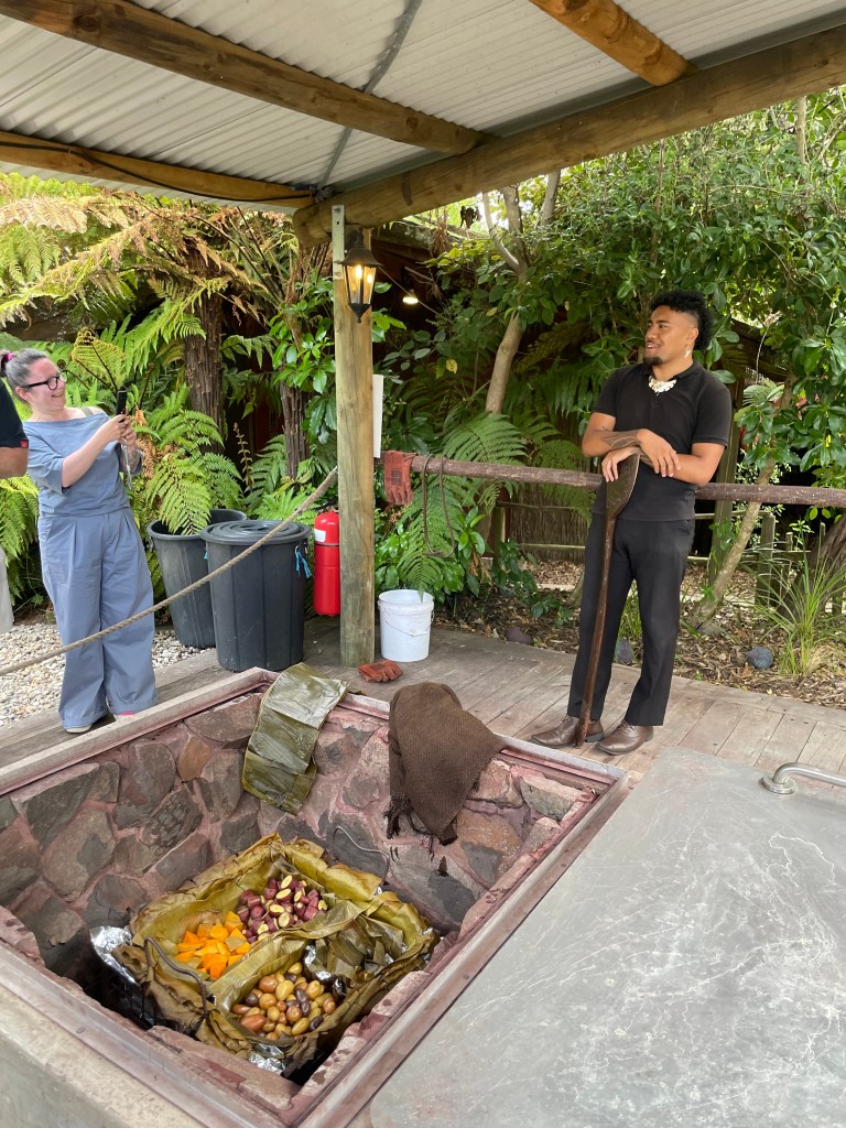 Our second event in Rotorua was a Māori tour called Te Pa Tu, a cultural experience with dinner. From our guide, we learned Pa sits at the epicenter of their communities. They were places of physical refuge in times of war, and they remain sanctuaries for the mind and spirit. It’s where they meet to discuss critical issues, celebrate occasions of significance and where they strengthen their understanding of who they are. Te PA Tu brings together these important occasions and presents culture and kai (cuisine) events, sharing Māori history, traditions, and future aspirations across four hours of celebration and feasting.